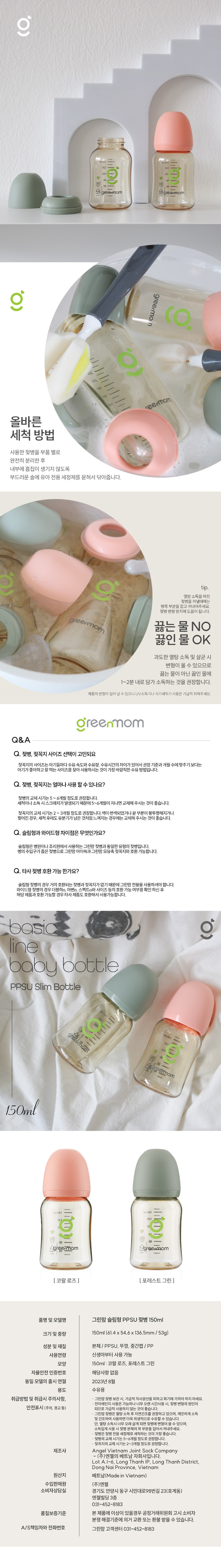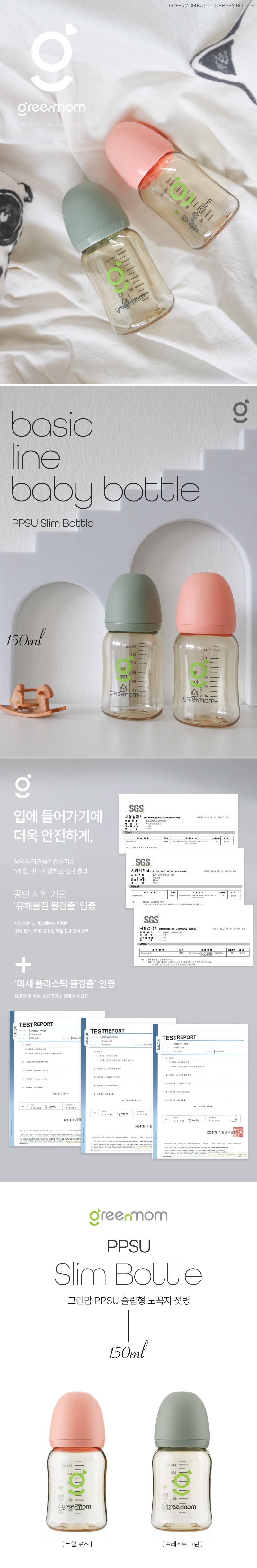 • 그린맘 베이직 PPSU 슬림 노꼭지 젖병 150ml