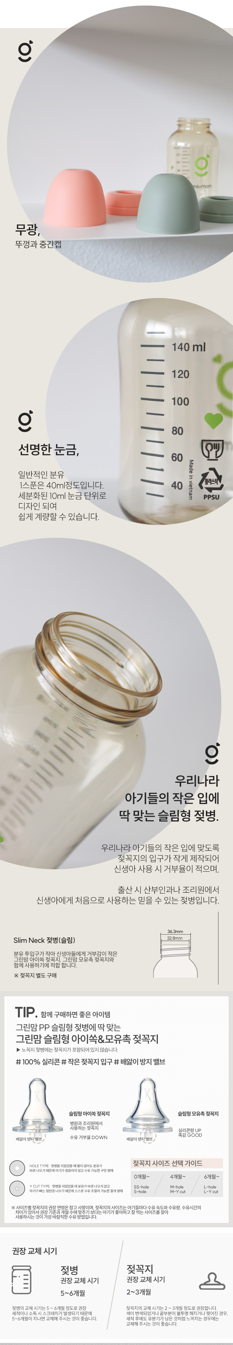 이미지 확대보기그린맘 베이직 PPSU 슬림 노꼭지 젖병 150ml