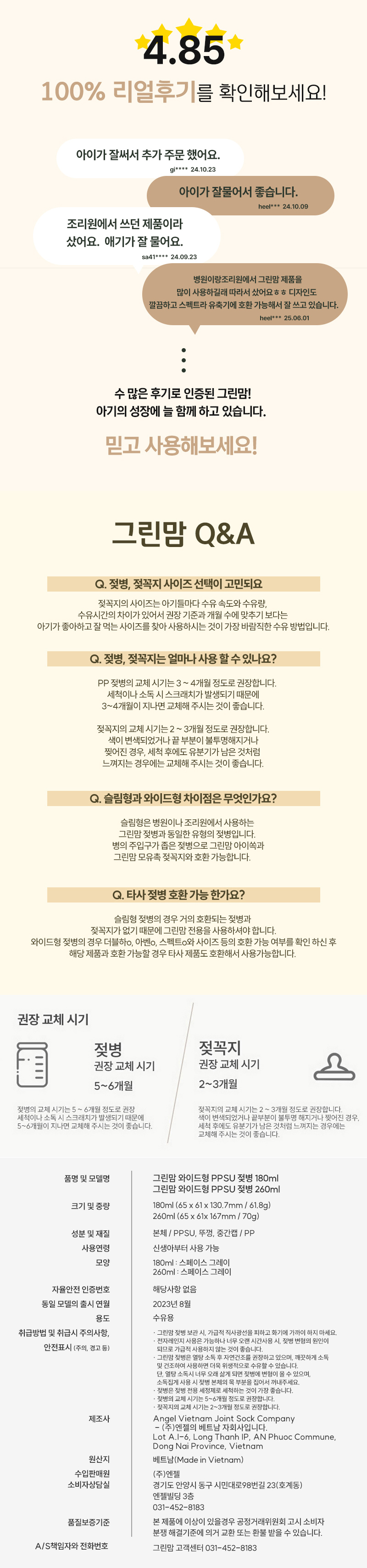 - 상품의 부자재 (젖병 인쇄 디자인, 스크류캡(중간캡), 막힌캡, 뚜껑색상, 포장케이스) 등은 회사 사정에 따라 변경 될 수 있으므료, 제품 불량으로 인정되지 않습니다.